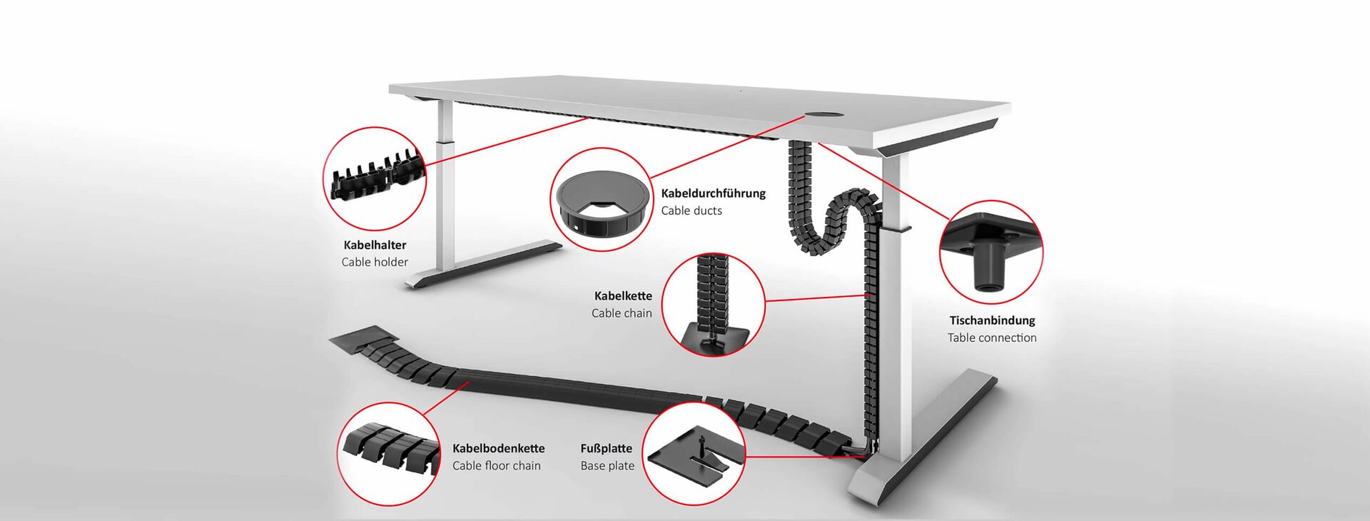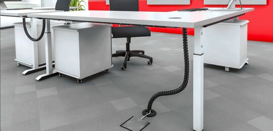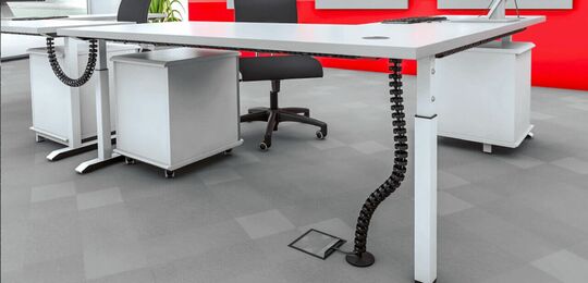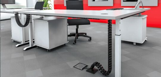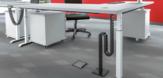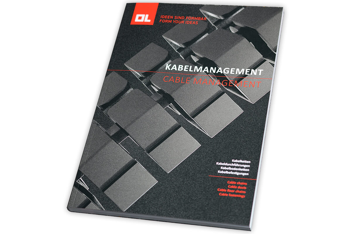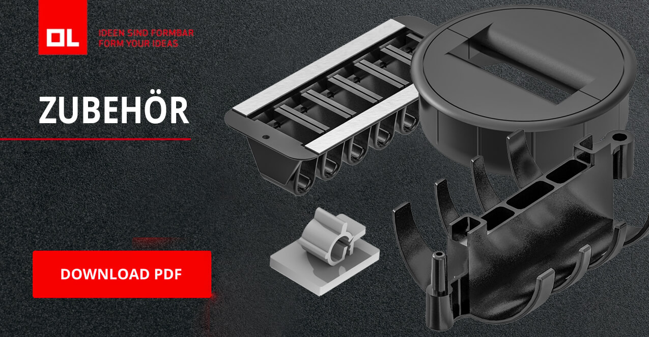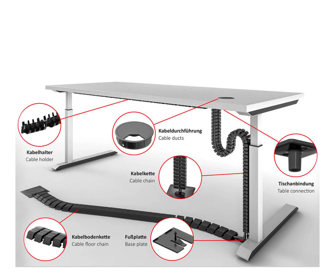 Laden Sie sich hierunser gesamtes Kabelmanagement-Programm mit allen Kabelketten, Tischanbindungen, Fußplatten, Adaptern, Kabeldurchführungen und Kabelbefestigungen herunter.